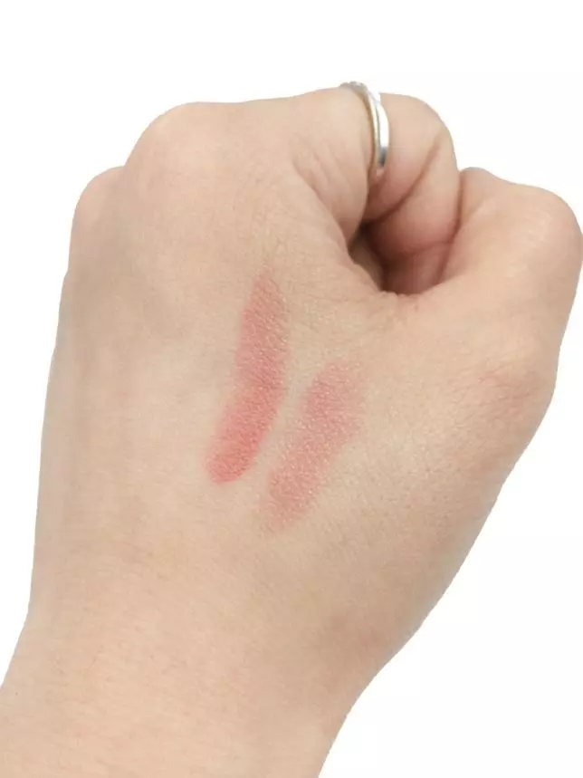先在手背上轻涂一层,可以看到手背纹理基本淡化,色泽感十足;厚涂一次后,可见颜色饱和感增强,水润十足。
