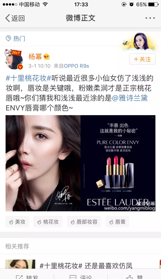 ta到底好在哪里呢,跟着小编往下看,先一睹大幂幂的风采,粉嫩柔润的正宗桃花唇方显十足女人味,日常妆,生活通勤,都可以驾驭的无懈可击。
