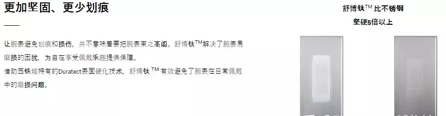使用钛材质做的手表,会穿插不同的手表系列。钛的耐磨程度是不锈钢的5倍,而且更加亲肤耐腐蚀,是高端手表会使用的材质。