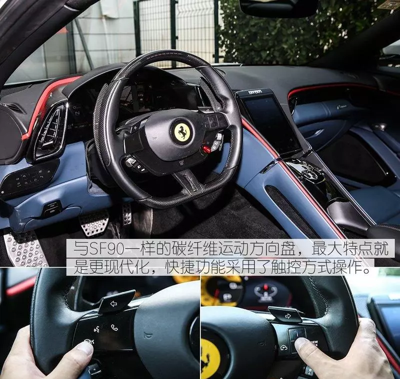 Roma采用了于SF90一样的碳纤维方向盘,功能键包括点火开关也都变成了全触控操作,好在最直击灵魂的manettino旋钮还维持原汁原味的操作方式,大部分功能都离不开一掌范围,这让驾驶者双手无需离开方向盘即可全面掌控。在车内还可以看到显示效果超级漂亮的16英寸仪表盘,8.4英寸中控显示屏以及需要选装的副驾驶娱乐屏幕。都说超跑的内饰只注重用料不注重配置,但是Roma车内营造的氛围绝对是法拉利中最具科技味道的。