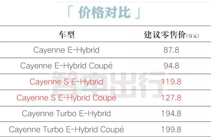 智电出行从保时捷官方获悉,新款Cayenne S E-Hybrid、Cayenne S E-Hybrid Coupe在中国市场启动预售,建议零售价分别为119.8万元、127.8万元,将于2024年4月开始交付。作为Cayenne家族第3款E-Hybrid车型,新车定位介于Cayenne E-Hybrid和Cayenne Turbo E-Hybrid之间,换搭3.0T插电混动系统。