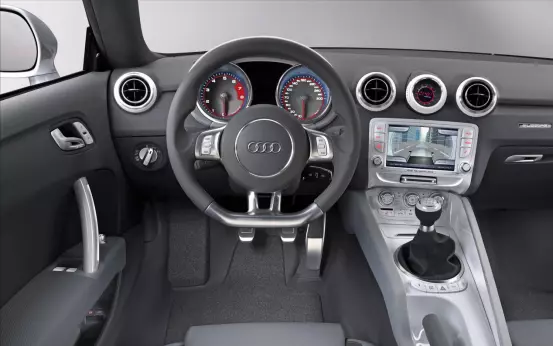 内饰方面,第二代TT没有初代车型那么讲究设计细节,但也在多方面体现了那个年代的科技感+豪华感,比方说采用了带MMI系统的中控车机(仅限国外版本)、炮筒式仪表,更大面积的皮质包裹,包括换挡座两边,面板,扶手以及手刹等。除此以外,还用了R8同款的多功能平底运动方向盘,而中间三个出风口的设计,也沿用到下一代车型。