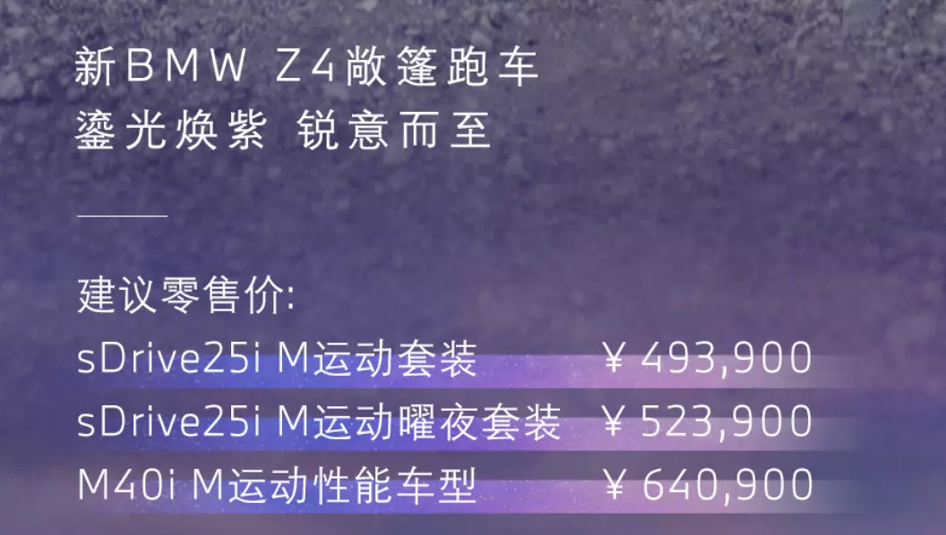 新款宝马Z4敞篷跑车上市 在外观设计方面,新款宝马Z4采用更新的横向视觉风格网状“双肾”格栅,延续老款车型“三段式”下进气口、扩展至轮拱上方的大尺寸发动机舱盖。车辆下格栅两侧进气口可将空气导入到侧面气帘,减少轮拱附近的“湍流”,这个位置也经过升级。动力方面,参考国内在售车型,Z4 sDrive25i车型搭载2.0T四缸发动机,最大功率145千瓦,峰值扭矩320牛·米,0-100公里/小时加速时间为6.7秒;Z4 M40i车型搭载3.0T直列六缸发动机,最大功率250千瓦,峰值扭矩500牛·米,0-100公