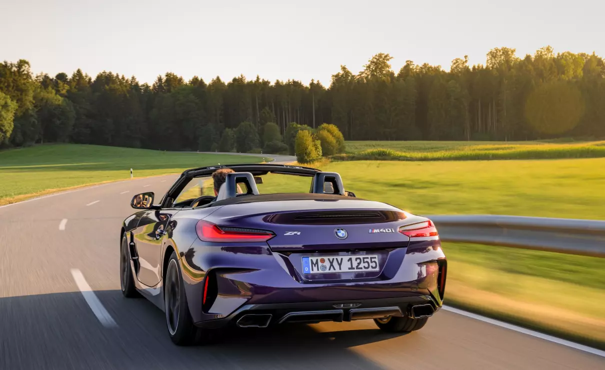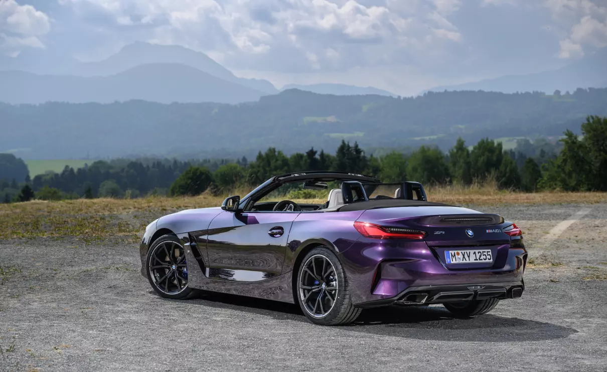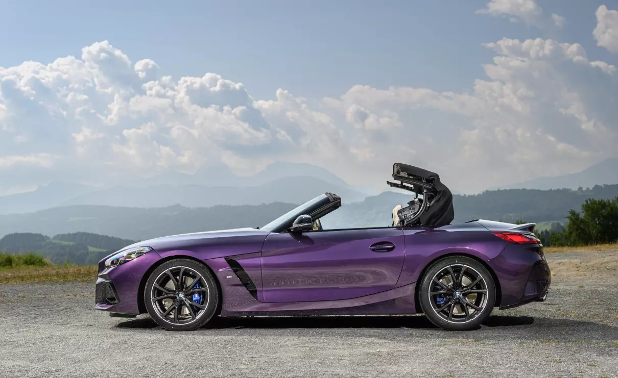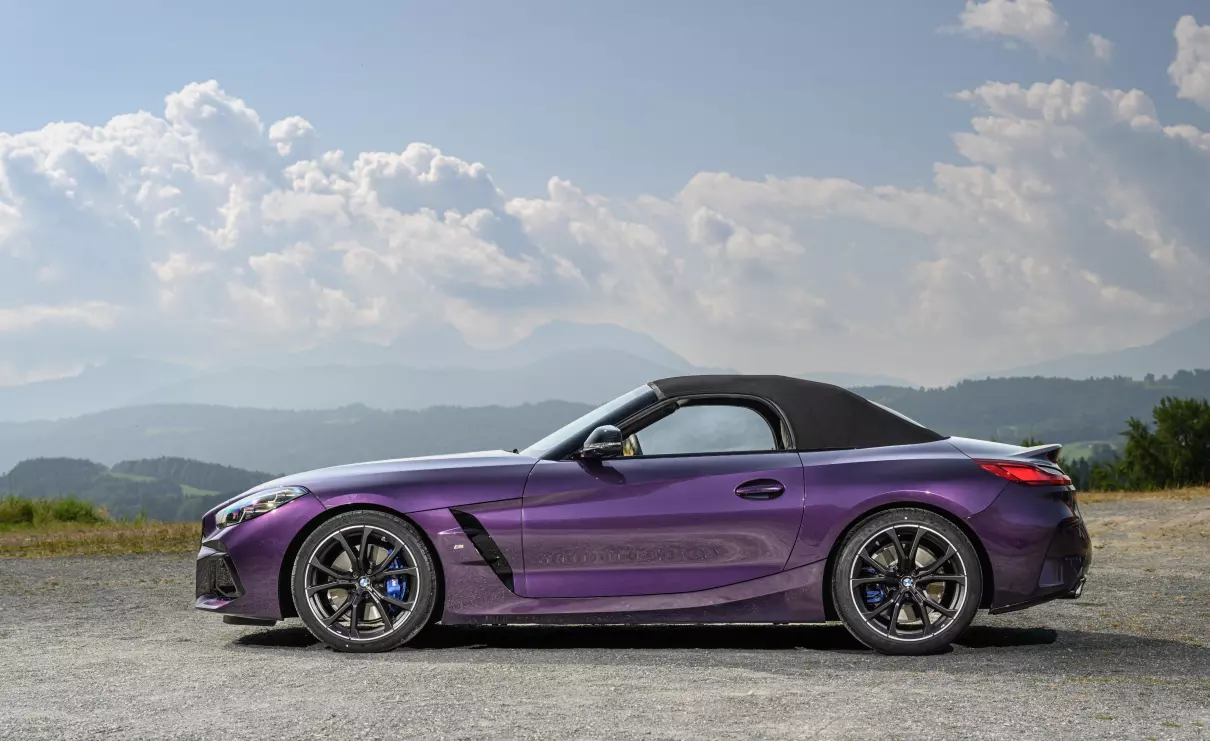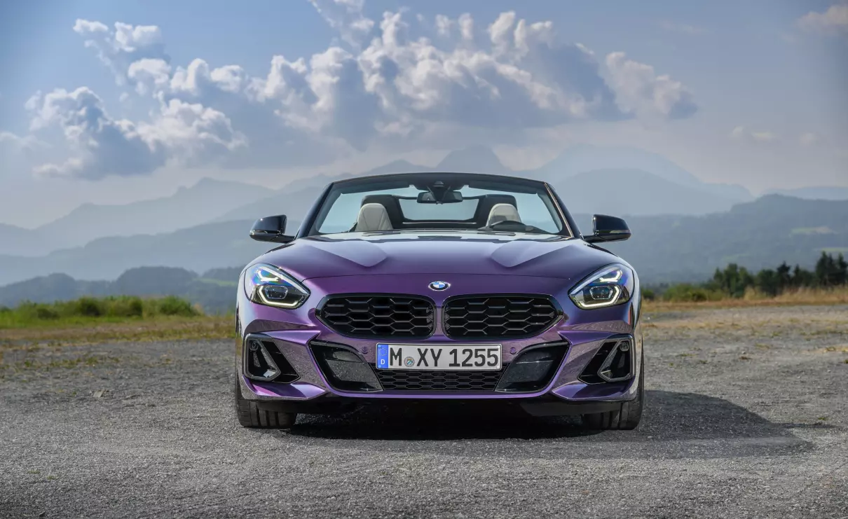 新款宝马Z4敞篷跑车上市 在外观设计方面,新款宝马Z4采用更新的横向视觉风格网状“双肾”格栅,延续老款车型“三段式”下进气口、扩展至轮拱上方的大尺寸发动机舱盖。车辆下格栅两侧进气口可将空气导入到侧面气帘,减少轮拱附近的“湍流”,这个位置也经过升级。配置方面,新车标配19英寸双辐样式的M铝合金轮辋,提供宝石青、波尔蒂芒蓝、摩天灰、闪电紫、三藩红、雪山白共6款车漆,以及可供选择的熏黑M灯带增强运动效果。车辆的软顶篷则继续提供黑色和墨灰色软车顶带金属银效果。在车速低于50公里/小时时,电动顶蓬可在10秒内开闭。