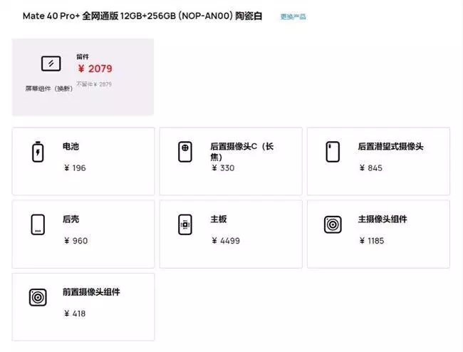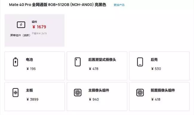 其中,Mate40 Pro更换屏幕需1679元,更换主板3899元,主摄像头940元。Mate40 Pro+更换屏幕需2079元,主板4499元。