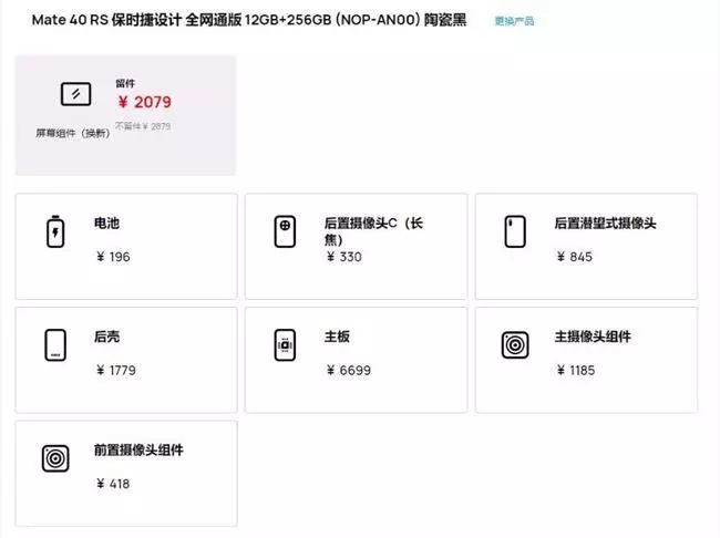 Mate40RS保时捷设计更换屏幕2079元,主板6699元,后壳1779元。