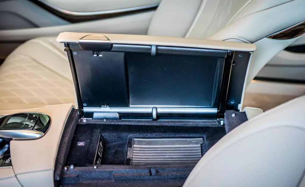 另外还有可以两边开启的中央扶手储物盒,这样的设计不仅独特而且满足了主副驾的实用性。同时S450 4MATIC也是与时俱进的,在这个中央扶手盒内不仅有两个USB口为设备充电,同时还带NFC功能,可以更好的实现车辆和手机的互联。这里也能说明这款车的第四个关键词“细节”。
