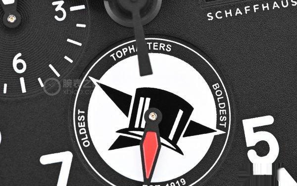 小秒盘的样式非常别致,品牌设计师将飞行中队的徽章作为小秒盘的表盘,我们在图中看到的是“tophatters”中队经典的高帽徽章,辨识度很高。