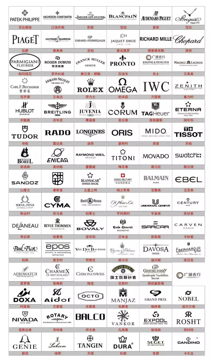 还有理查德米勒RICHARD MILLE、萧邦Chopard、帕玛强尼Parmigiani、罗杰杜彼Roger Dubuis、弗兰克·穆勒Franck Muller、百浪多PRONTO、名士Baume & Mercier、艾美表MAURICE LACROIX、艾美达Armand Nicolet、宝齐莱Carl F.Bucherer、劳力士Rolex、欧米茄OMEGA、万国表IWC、真力时ZENITH、宇舶表HUBLOT、百年灵Breitling、尊皇表Juvenia、昆仑表Corum、泰格豪雅TAG Heuer、绮年华ETERNA、帝舵Tudor、雷达表Rado、浪琴Longines、豪利时Oris、美度Mido、天梭Tissot、依波路Ernest Borel、英纳格ENICAR、蕾蒙威Raymond Weil、梅花表Titoni、摩凡陀Movado、斯沃琪SWATCH、山度士SANTOZ、康斯登Frederique Constant、五星上将BLANSACAR、瑞士军表SWISSARMY、宝曼表Balmain、玉宝表EBEL、铁达时表Solvil et Titus、西马表CYMA、柏莱士Bell & Ross、亨利慕时H. Moser & Cie、宇宙表Universal、世纪表Century、帝后表Delaneau、梭曼表Revue Thommen、宝华利BOVALY、艾米龙Emile Chouriet、世家表Sarcar、卡纷表CARVEN、柏高Paul Picot、爱宝时Epos、梵德宝Bauwede、库尔沃Cuervo y Sobrinos、迪沃斯Davosa、依百克表EBERHARDCo、爱罗表AEROWATCH、查梅斯CHARMEX 、瑞宝Chronoswiss、瓦斯针Westend、高珀富斯表Greubel Forsey、君皇CONCORD。