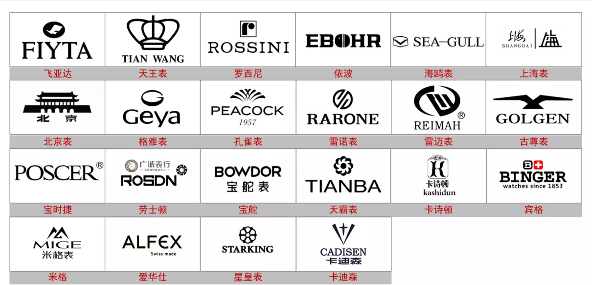 还有上海表SHANGHAI、北京表BEIJING、孔雀表PEACOCK、格雅表GEYA、雷诺表RARONE、雷迈表REIMAH、古尊表GOLGEN、宝时捷POSCER、星皇表STARKING、劳士顿ROSDN、宝舵BOWDOR、天霸表TIANBA、卡诗顿KASHIDUN、爱骏达ARRIGO ARGENTI、宾格BINGER、欧利时OLEVS、卡迪森CADISEN、米格MIGE、爱华仕OIWAS、北极星表POLARIS、冠琴GUANQIN等。