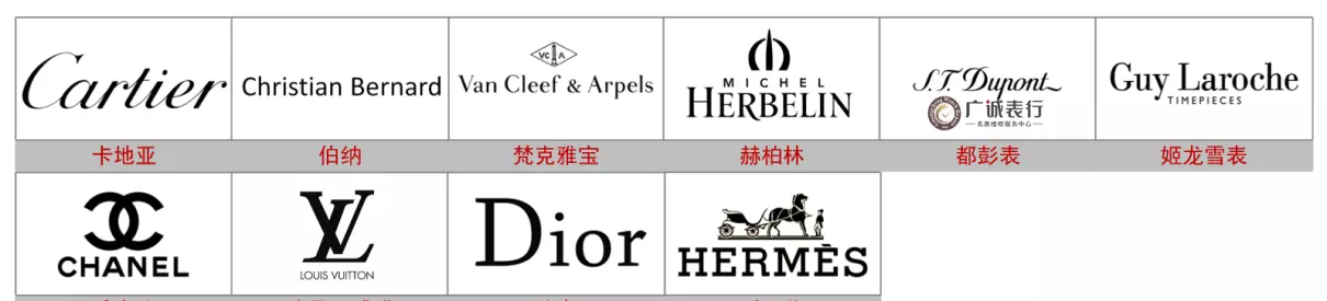 还有赫柏林Michel Herbelin、伯纳Christian Bernard、雍加毕索YONGER & BRESSON、都彭表Dupont、姬龙雪表GuyLaroche、爱马仕Hermès、路易·威登Louis Vuitton、迪奥Dior等。