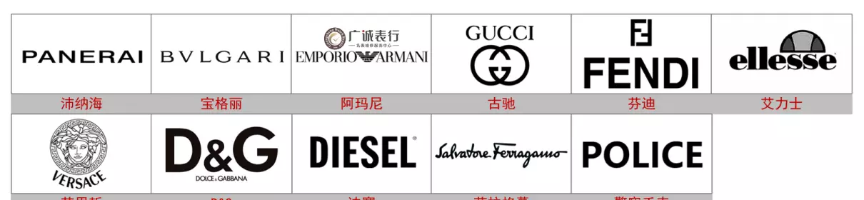 还有古驰Gucci、芬迪Fendi、艾力士Ellesse、范思哲Versace、 D&G、迪赛Diesel、菲拉格慕Ferragamo、警察手表Police等。