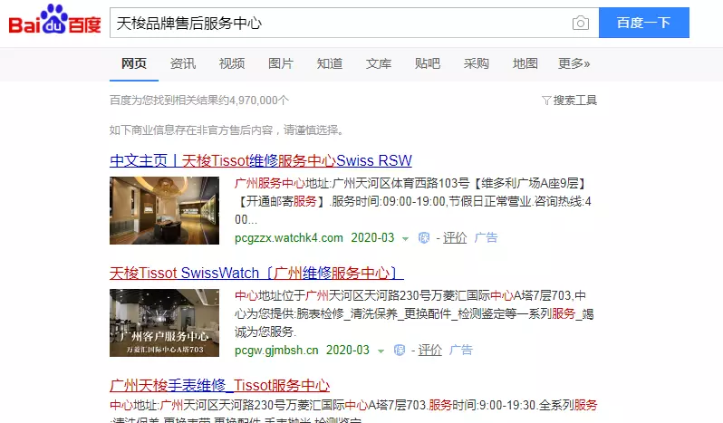 笔者通过百度分别以“天梭品牌售后服务中心”“宝珀品牌售后服务中心”做为关键词进行搜索,搜出来排名前五的,都是带有“广告”标识的维修中心,而这些维修中心,都标榜是“天梭维修服务中心”或“宝珀维修服务中心”。排名第一显示为“中文主页丨天梭Tissot维修服务中心Swiss RSW”,用该网站提供的地址,在天梭官方进行查询,未查询到官方授权信息。另一边排名第一显示为“广州宝珀服务中心—Blancpain Swiss RSW SA维修”,该维修中心位于体育西,而宝珀官网的广州唯一服务点位于体育东路财富广场。显而易见,这些百度搜索出来的号称品牌的维修点,都没有官方授权,而受害的王先生和杨小姐所说的网上找的“品牌官方售后点”,极大可能找到的就是这类型的店铺。