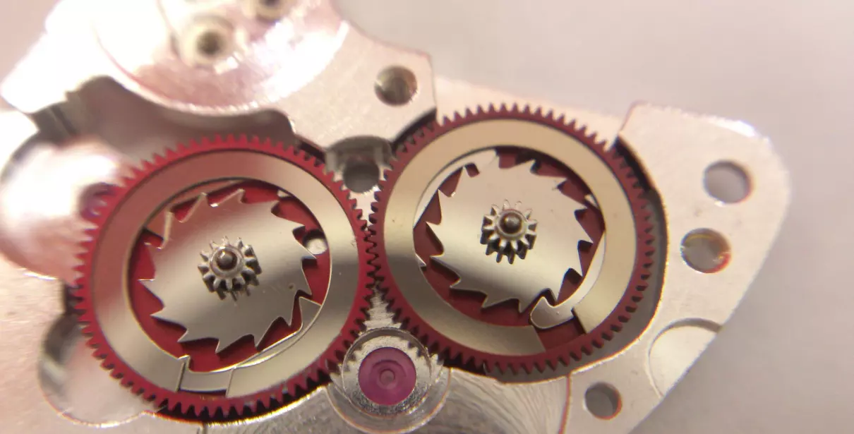 一个换向轮分为双层,红色箭头所指的为内轮,蓝色箭头所指为外轮。外轮里面有棘爪,就像手动上链机芯里面的棘爪一样只能让齿轮朝一个方向转动,另外一个方向就不行。通过这样的设计,当内轮和外轮结合在一起的时候,外轮受到力量逆时针转动,里面的内轮就会被卡住,进而内轮就会跟着外轮一起转动。如果外轮受到力量顺时针旋转,里面的内轮就会打滑,内轮不会随着外轮一起转动。
