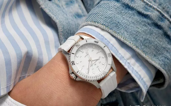 这是一款运动型的女生石英手表,白色的陶瓷表圈,搭配了精美白色表盘。刻度、指针均有夜光涂层,精准掌握潜水时间。表盘直径为37mm,采用精钢表壳,单向旋转陶瓷表圈,以及人工合成蓝宝石玻璃表镜。柔软轻巧的橡胶表带。运动感和科技感兼备。具备100米防水深度。
