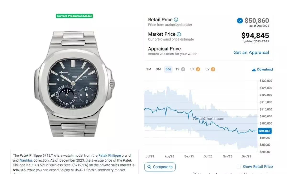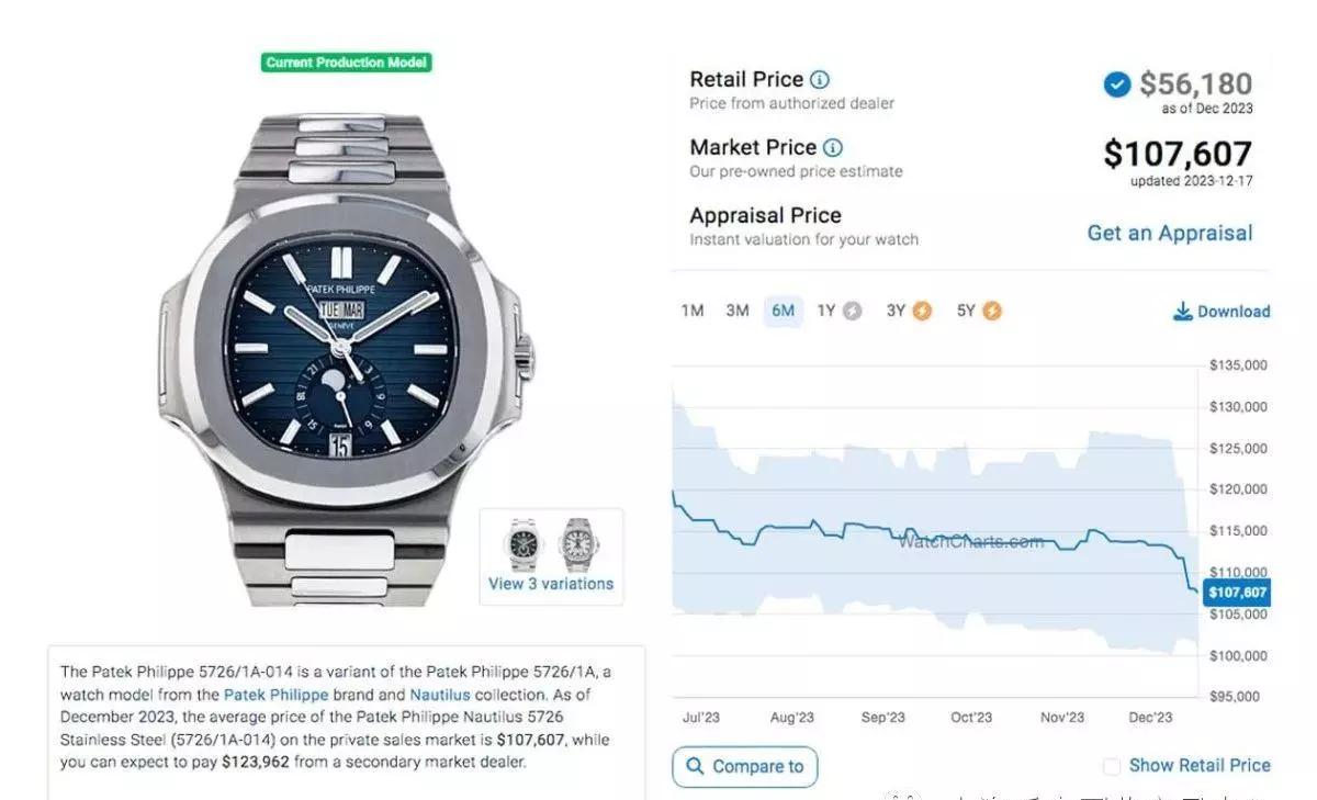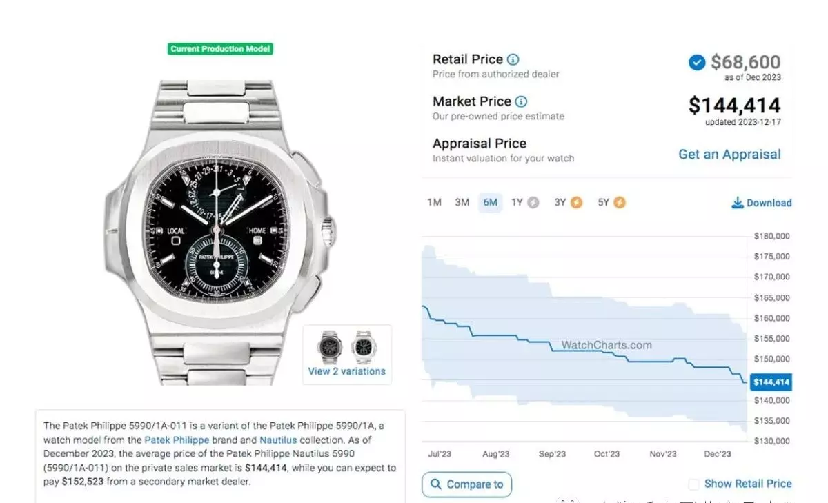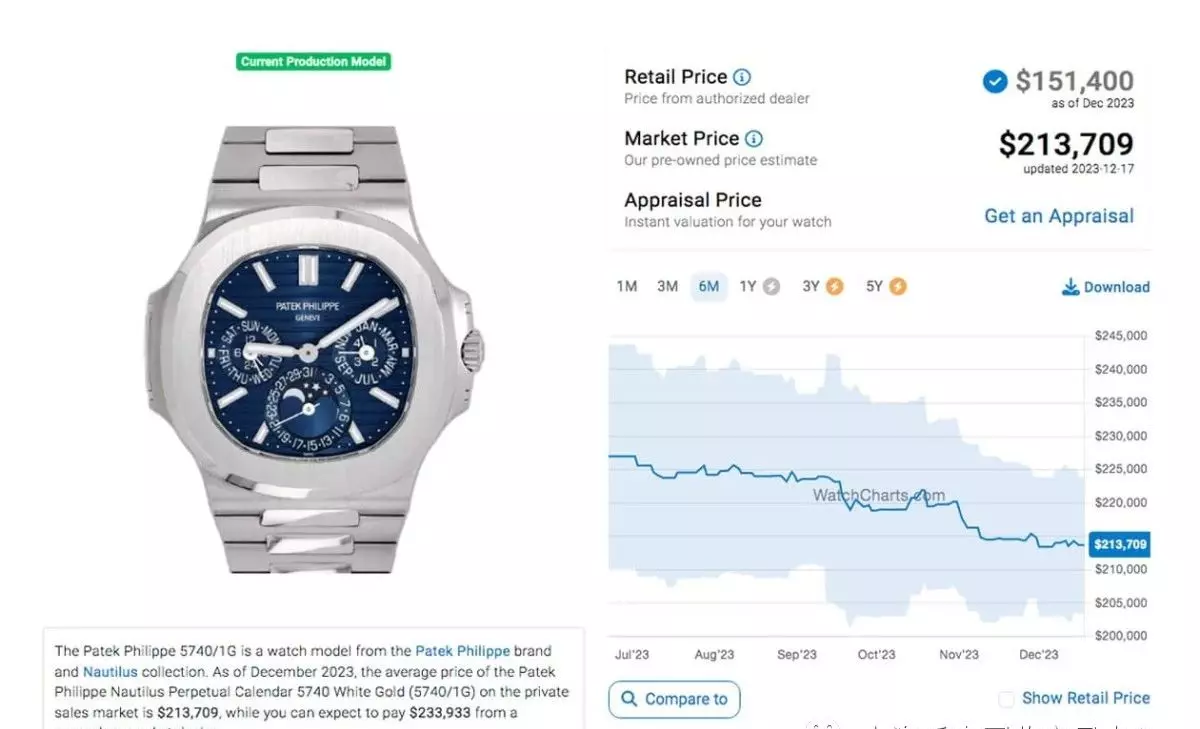 而来到2023年末,距离前述观察期约莫过了半年之久后,同样由WatchCharts网站查找到的行情资料,五款表裡面多数款式的价格走向都很一致,呈现缓步下滑的状况,唯独5811/1G一枝独秀的行情在过去半年期间相对稳定许多,价格起伏变化不大,近期稍降至145,840美金的水準,与上个月的表现相去不远。至于其他四款的表现分别是5712/1A:94,845美金、5726/1A:107,607美金、5990/1A:144,414美金,和5740/1G的213,709美金,与半年前相比,这几款的行情又再多缩水了些。