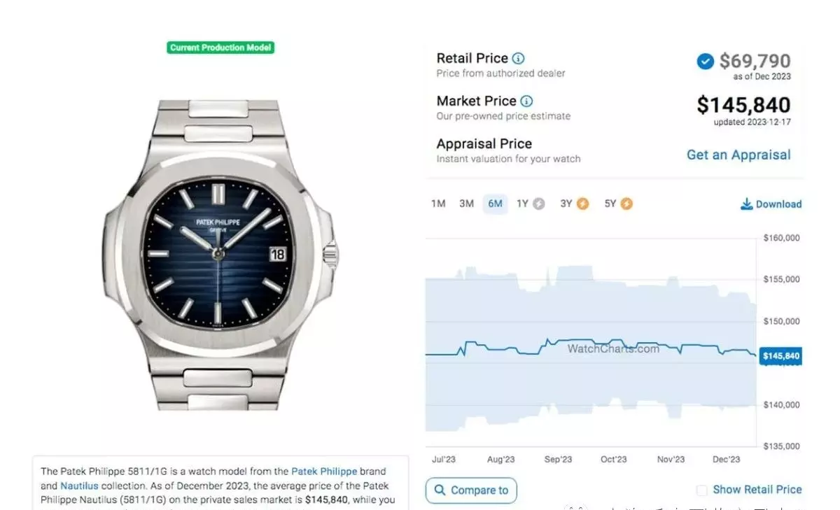 根据高级手表市场调查研究机构WatchCharts的资料,5811/1G在2023年第二季尾声的身价还有146,054美金,这已经是手表跌了超过一年后的表现,其他的型号在同时期的身价分别为5712/1A:109,449美金、5726/1A:119,977美金、5990/1A:163,013美金,以及5740/1G的226,972美金,每款都处于超定价状态,而且溢价率都还不是一点点而已。