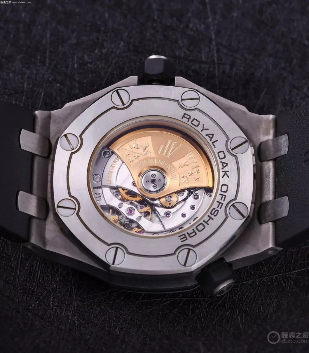 对比机芯,离岸型15710使用爱彼上一代3120自动机芯。皇家橡树15500使用爱彼新一代4302自动机芯。上一代3120机芯尺寸26毫米;新一代4302机芯尺寸32毫米。对比可见,新一代机芯要大出一圈,比例更协调。上一代3120机芯在离岸型上,就显得有点儿小。不过在售款离岸型潜水表15720上也换装了新一代4300系列机芯,解决了老机芯偏小的问题。