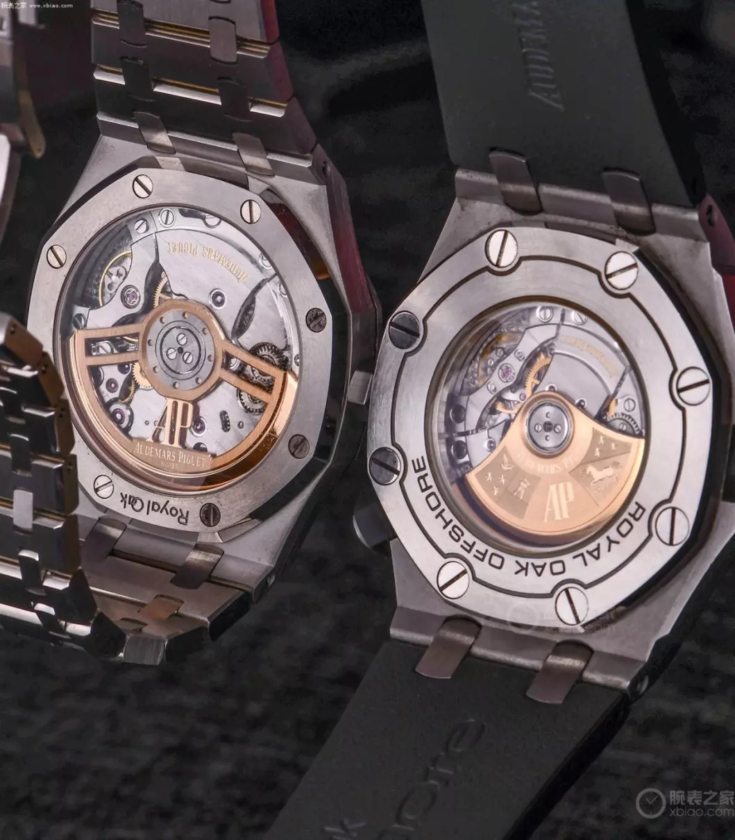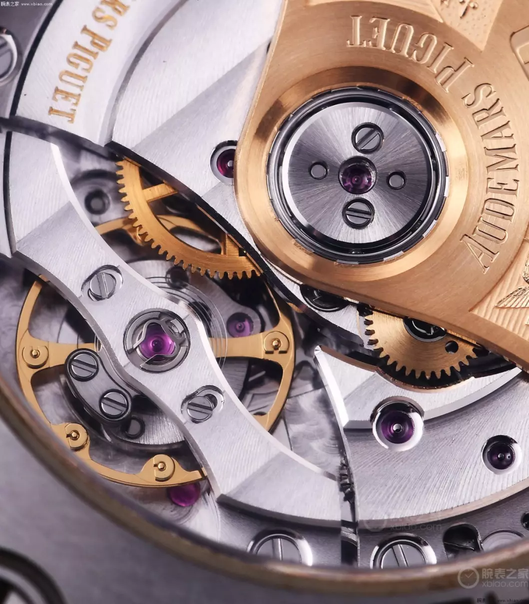 皇家橡树15500新一代4300系列机芯(左)对比离岸型潜水表15710上一代3120机芯(右)。