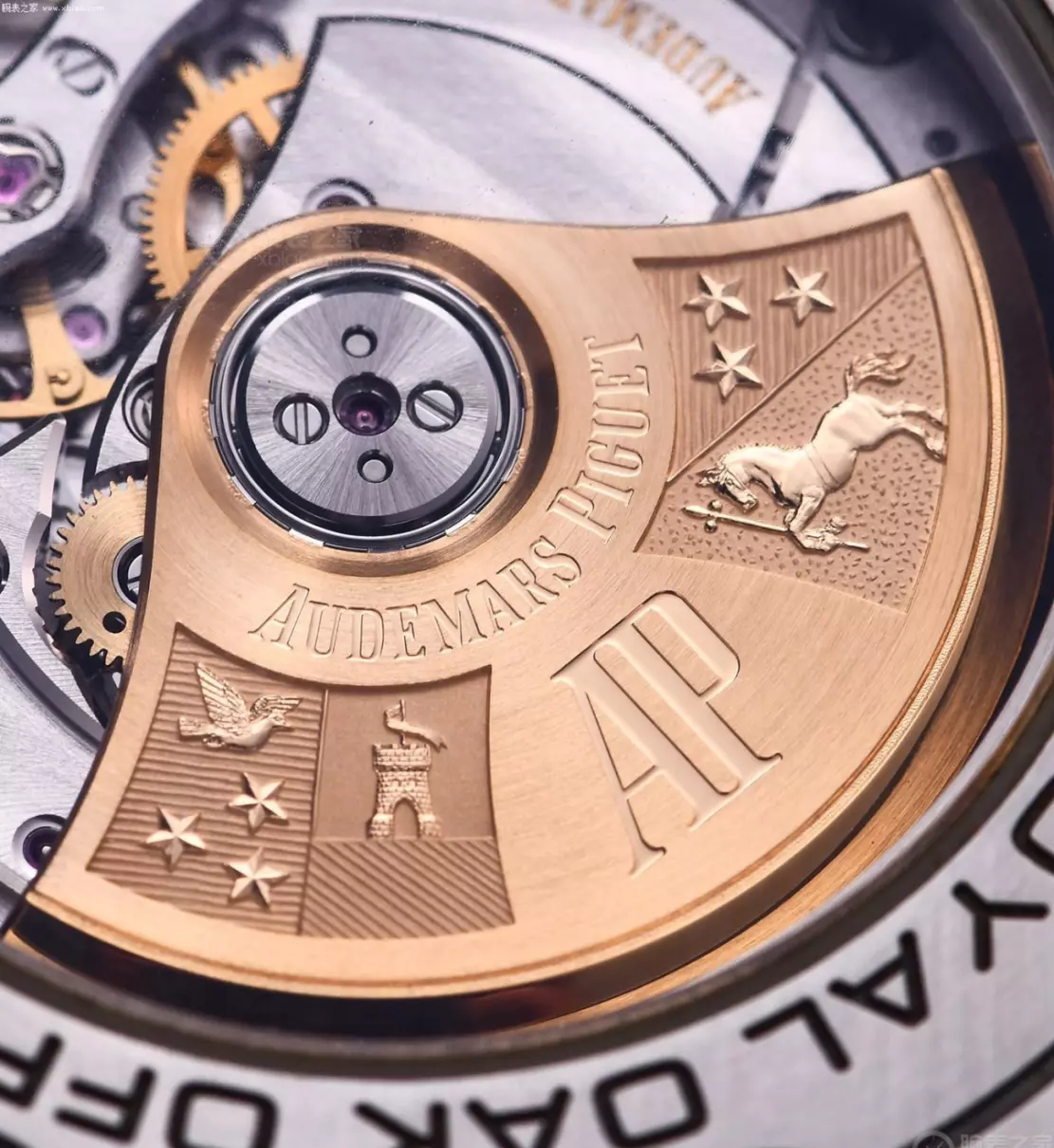 我照片里的这只离岸型潜水表15710,使用的是爱彼3120自动机芯。虽然3120机芯现在已经被爱彼新一代4300系列机芯替代,但3120机芯在当年,曾被誉为“最美自动机芯”。爱彼对机芯的标准是,虽然不打日内瓦印记,但机芯和日内瓦印记标准一致(爱彼表厂因为不在日内瓦,所以打不了日内瓦印记)。像日内瓦印记要求的“肾形”游丝外桩,爱彼3120机芯上也都是标配。我们可以看到,3120机芯的8微调砝码摆轮,8个微调砝码在今天已经非常罕见了(现在都缩减数量了)。爱彼两个家族徽章雕刻的全金自动陀,精美且壮丽,在今天也很少见了。