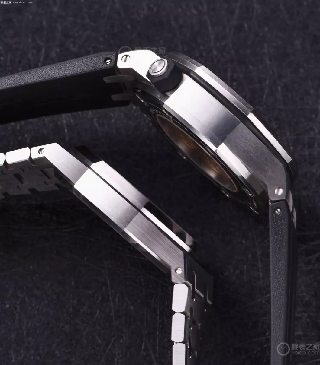 对比侧面,两只表的厚度,就相差很大了。离岸型15710厚度14毫米,皇家橡树15500厚度10.5毫米,差异明显。