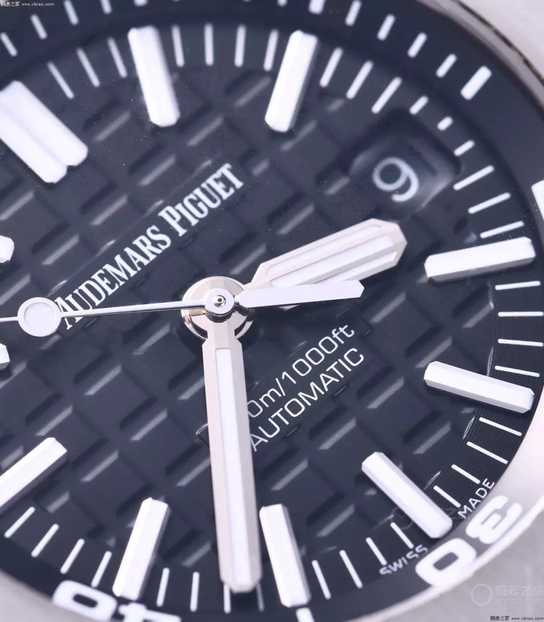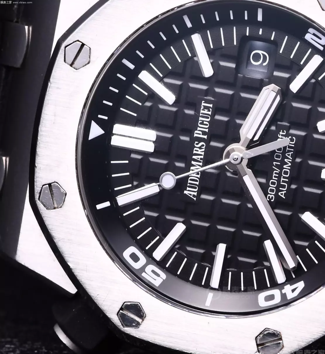 皇家橡树离岸型潜水表的盘面,相比常规款皇家橡树,就显得比较粗犷了。指针、时标都有加粗,3点位的日历配了一个小放大镜。在盘面上,离岸型潜水表,使用的是爱彼大型格纹装饰。相比常规款皇橡的小格纹,有明显差别。