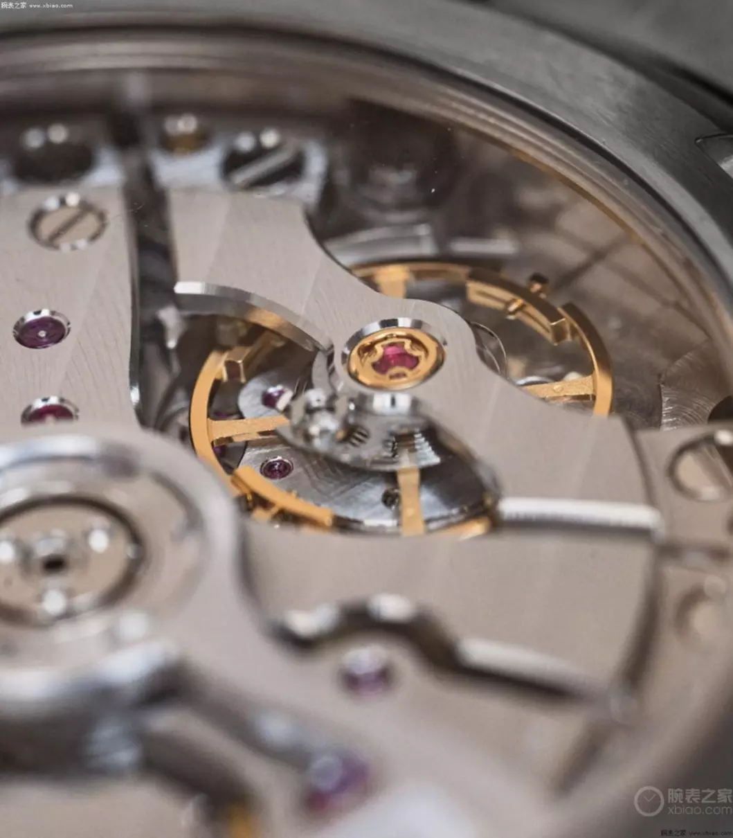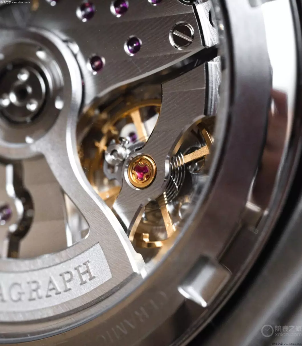 冠蓝狮9SC5机芯,除了计时模块部分外,其他部分,从背透看上去,和大三针机芯9SA5基本一致。机芯核心的擒纵机构,同为冠蓝狮新一代“双冲击擒纵”。冠蓝狮“双冲击擒纵”和欧米茄“同轴擒纵”有相同的技术原理和历史源头。擒纵运行效率,比常规的杠杆擒纵,提升17%左右。机芯摆频36000高频,得益于更高效率的擒纵,动力72小时,是动力存储最长的高频计时机芯之一。机芯60颗宝石轴承,每天误差+5/-3秒。