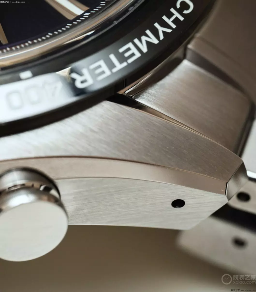 冠蓝狮Tentagraph,使用钛壳、钛表链(5级钛),尺寸43.2毫米,厚15.3毫米。作为一只运动计时表,尺寸正常,厚度会厚一些。钛壳颜色偏灰,表壳大面积拉丝,在表壳边缘,表耳边缘,进行抛光。表壳打磨非常锐利。手表的圆头计时按钮,有那么一点儿“蘑菇钮”的味道。防水100米。
