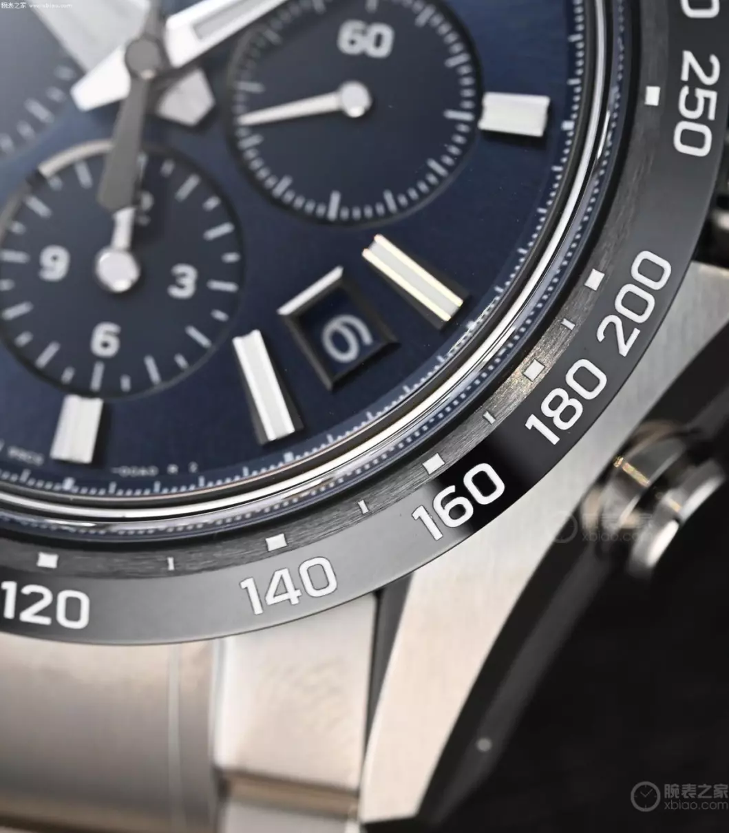 Tentagraph使用陶瓷表圈,这只表的陶瓷圈,外圈数字一圈抛光,内侧刻度一圈拉丝,陶瓷圈组合两种打磨方式,在名表世界中,很少见。抛光和拉丝的组合,形成了一定明暗效果,细节装饰非常到位。