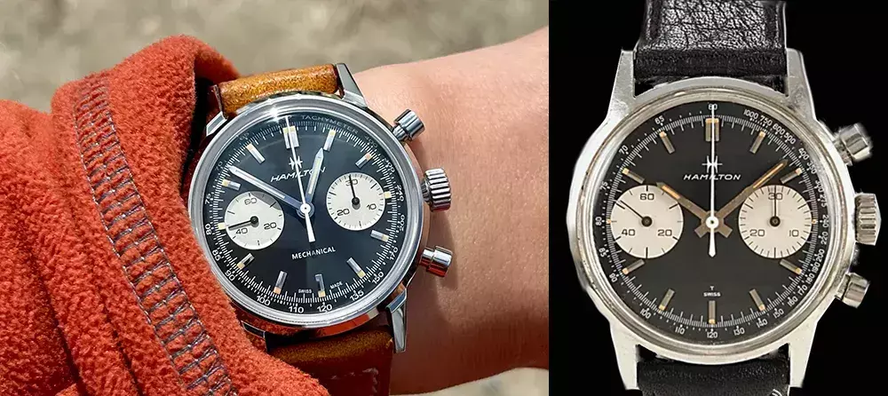 汉米尔顿Intra-Matic Chronograph H手动计时码表(左)及其原型表(右)