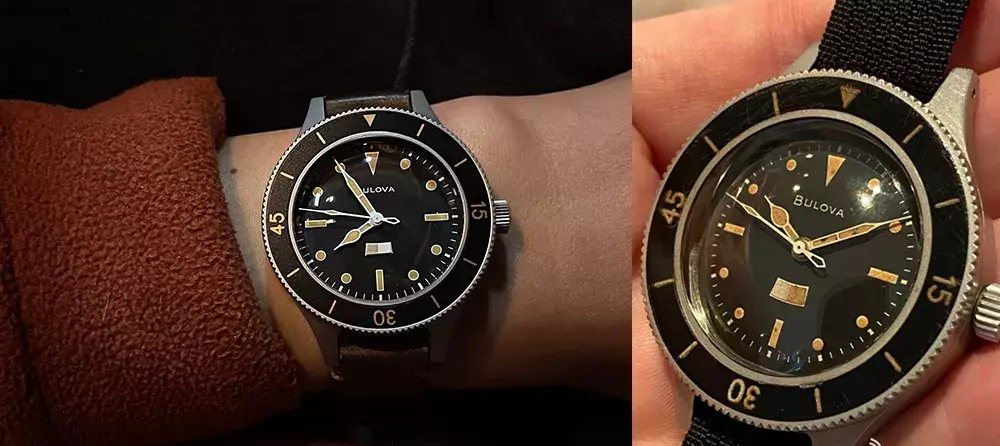 宝路华也是去年推出了一款非常具有传奇色彩的复刻潜水表,原型表是1958年应美国海军要求设计的军用潜水表,虽然因为没有那么被人所知,但当年和它一起送到美军检测可是大名鼎鼎的五十噚,原汁原味的配备了按压式双向旋转表圈、湿度计等等,而且它在当年防水等级已经达到了120米。