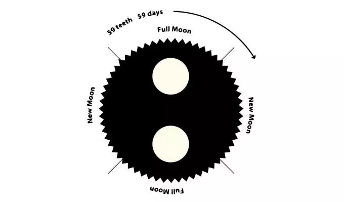 月相的平均周期是29天12小时44分2.82秒,约等于29.53天(即月龄),也就是说,每隔29.53天,我们就能看到两个一模一样的月亮脸。因此,一般的月相圆盘齿轮采用29.5天的双倍数59作为轮齿瓣数。每天,月相盘齿轮向前推进一齿,便能显示出当晚月亮的形状了。