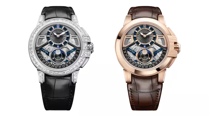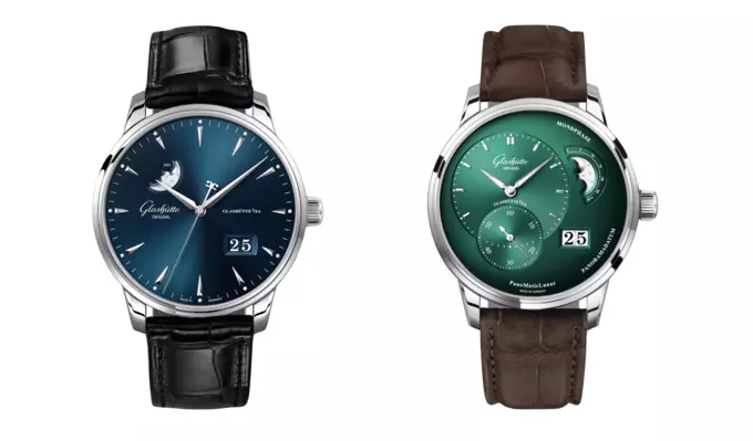 格拉苏蒂原创 议员卓越大日历月相腕表(左)偏心月相腕表(右)