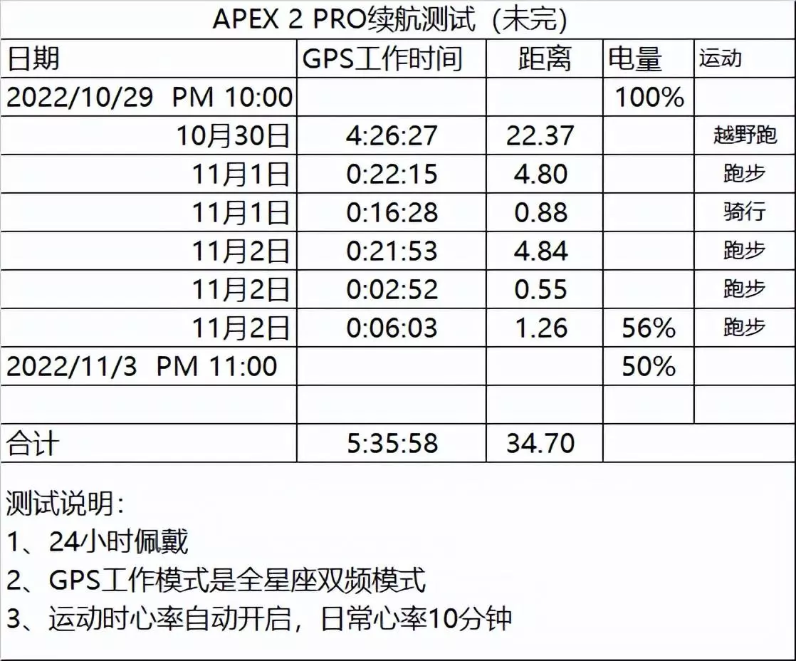 本文结稿时,APEX 2 PRO一个续航周期还没有结束,用了5天,电池大概消耗50%,全天佩戴、没开音乐、GPS是双频全星座模式。