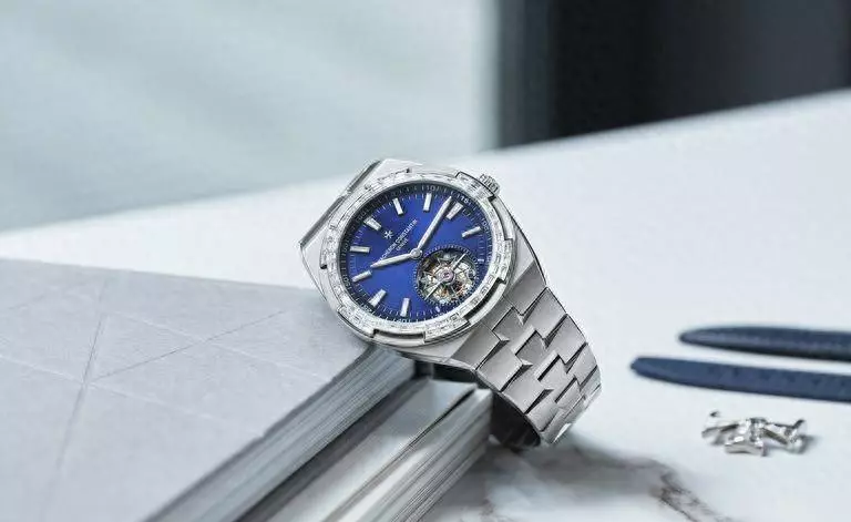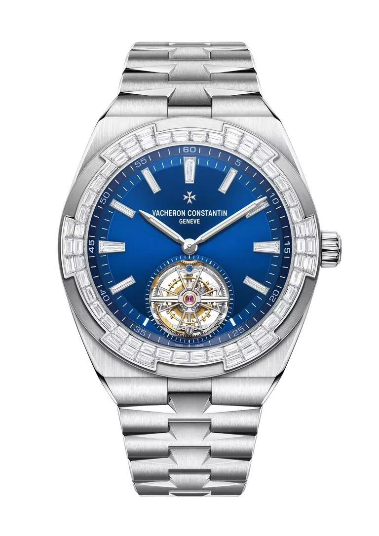 江诗丹顿倾力推出Overseas纵横四海系列陀飞轮高级珠宝腕表,为这一代表着旅行探索精神的时计系列引入两大全新设计元素:Overseas纵横四海系列陀飞轮表款首次搭配白金材质表壳及表链,并点缀标志性蓝色表盘;表圈、时标和表带针扣镶嵌长阶梯形切割钻石。腕表的表壳采用纤薄的曲线设计,内部搭载品牌自制2160超薄自动上链陀飞轮机芯,厚度仅5.65毫米,振动频率为2.5赫兹,具备80小时充沛动力储存,驱动时针、分针和陀飞轮框架上的小秒针精准走时。新款腕表另配两条可快速替换蓝色表带,分别采用橡胶和小牛皮制成,搭配同样无需工具即可快速替换的镶钻针扣。