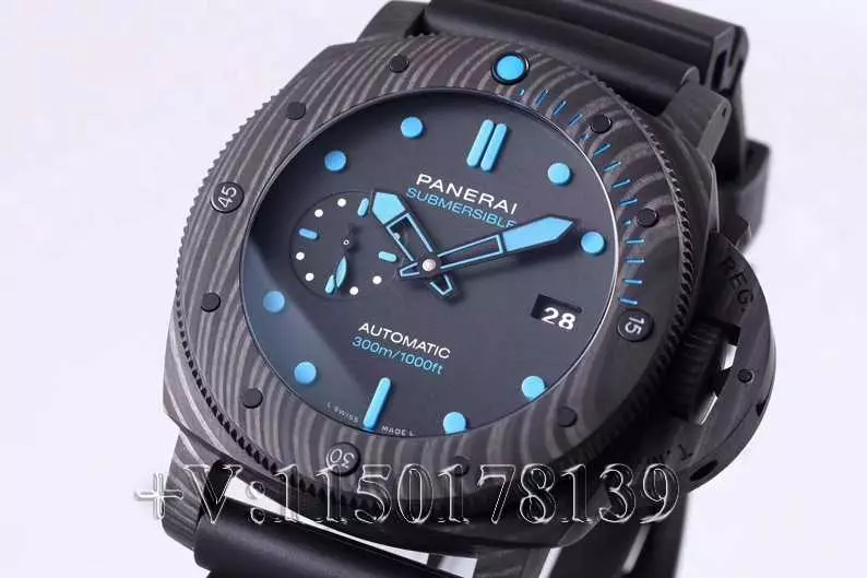 VS沛纳海1616搭配一条橡胶表带坚固耐用,迎合潜水需要,黑色底色以品牌的蓝色“OP”标志点缀,展现鲜明对比,并配搭沛纳海特制的梯形钛金属表扣,外层以黑色类钻碳镀膜加工。