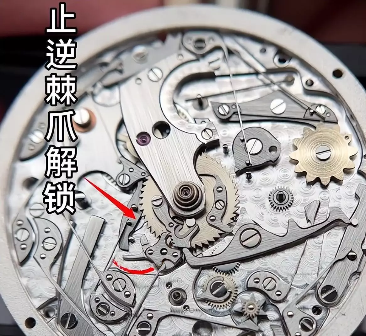 但是到了月末的最后一天,止逆棘爪旁边的触手就会卡到槽口里去,这时候止逆棘爪已经被推开,就失去的止逆作用,下面的蜗形弹簧自然就会把日历轮带回原点。