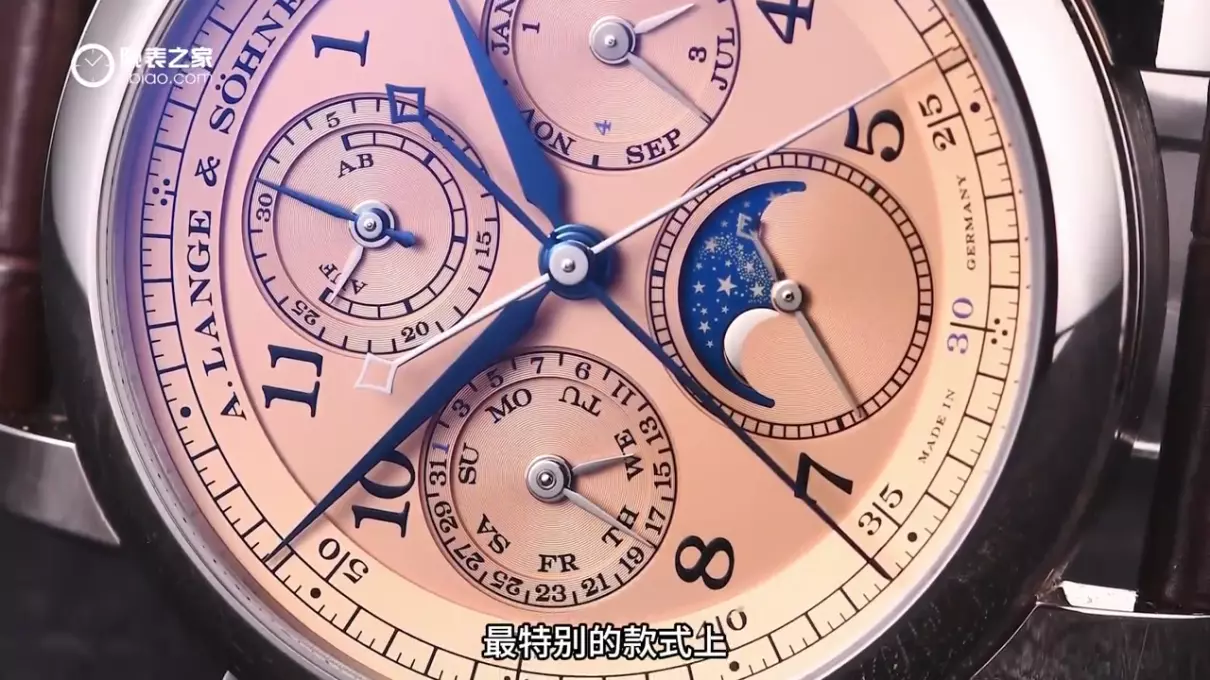 从十多年前开始,三文鱼配色就已经被专门用于最顶尖的款式中。这一点受到藏家和资深玩家的认可。在限量的1815追针万年历上,采用三文鱼配色,合情合理。同时,这款表的表盘采用18K、玫瑰金和实金制成。1815追针万年历的表盘布局四平八稳。四个小表盘准确地位于盘面的3、6、9、12点位上。动力显示和30分钟计时位于上方,月份和闰年位于右侧,小秒针和月相位于下方,日历和星期位于左侧。朗格的复杂计时分为两大体系。由于机芯源头不同,盘面布局也有所不同。1815追针万年历源自朗格大复杂表,其特点是盘面布局对称。与此不同,朗格DATO是L951机芯的发展成果,小计时盘位于盘面水平下。我这里展示了一个三文鱼盘面的DATO计时万年历陀飞轮,与1815追针万年历的布局形成鲜明对比。个人认为对称布局的1815更符合我的审美,1815追针万年历的盘面使用了数字时标。这是1815系列的显著特征,手表时分针、计时指针全部进行了烤蓝,而追针和其他万年历小指针则为银色镀铑。