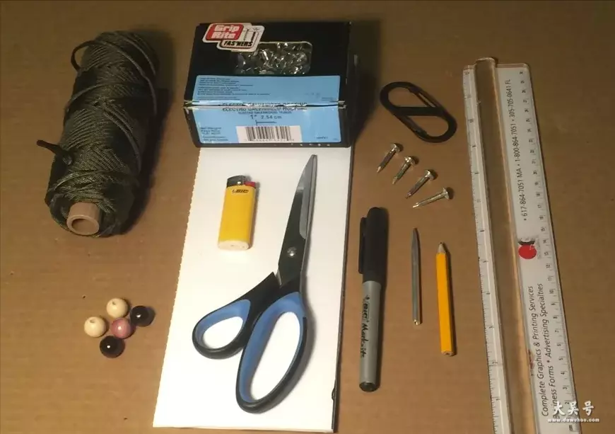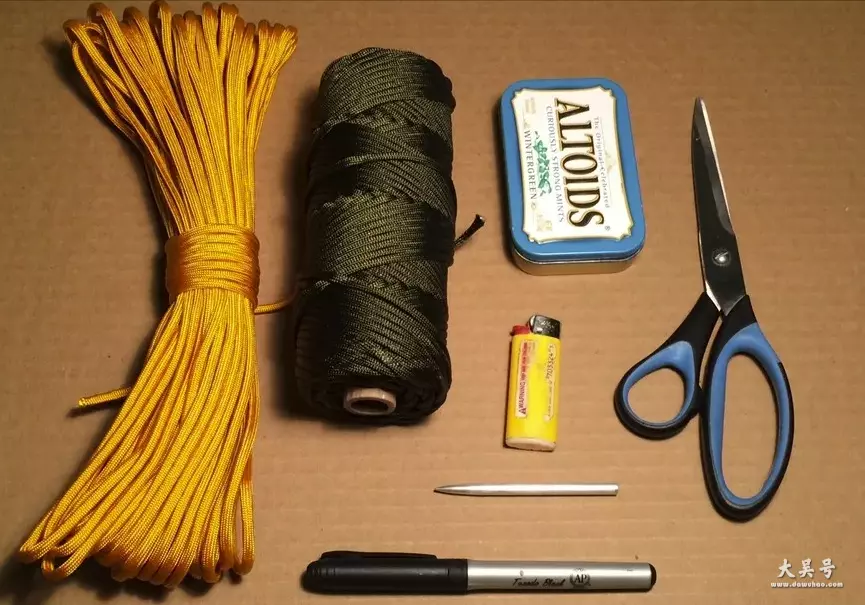 准备尼龙绳或棉绳彩绳一类,剪刀,打火机,记号笔,编绳用的针(藤编篮用到的那种针,如果没有的话用其它东西代替,只要方便绳子穿插即可)