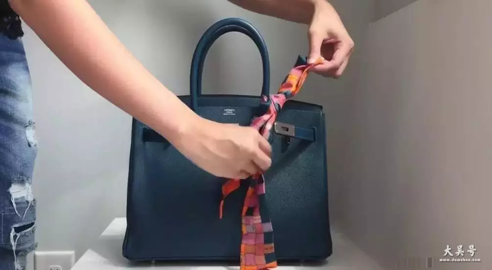step1:丝巾的一头在左边的手柄上打一个结,整理好小尾巴