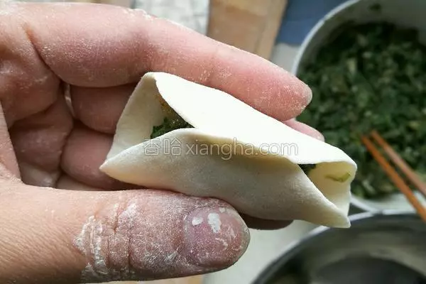 12、中指托住饺子肚,两手同时用拇指和食指捏紧饺子。