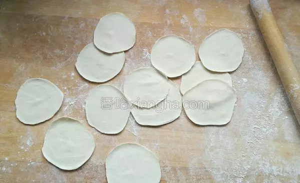 9、用擀面杖擀成四周薄中间略厚的饺子皮。大小直径和手掌宽差不多即可。