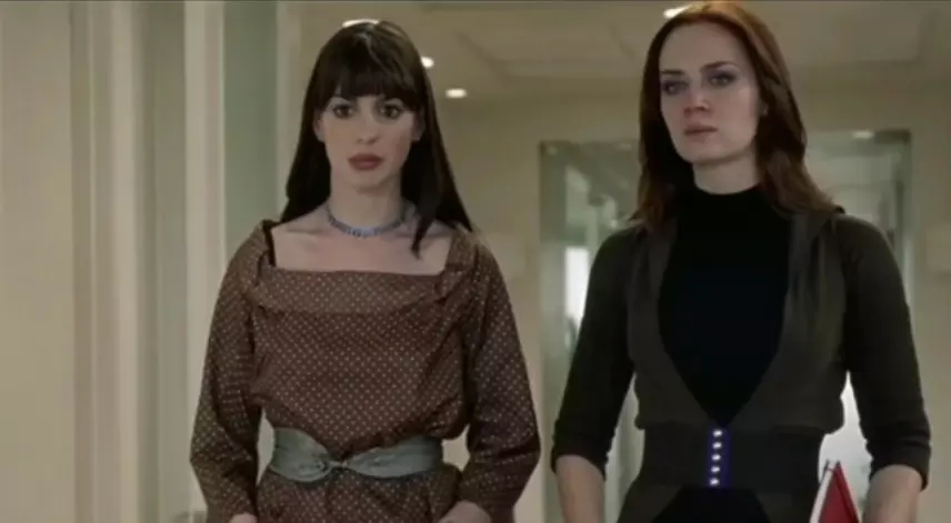 当安迪步入《RUNWAY》编辑部的第一天,她的着装简单而朴素,穿着宽松牛仔裤、平底鞋和简单的卫衣,发型也很随意,并没有过多的修饰,这样的着装在时尚界中显得非常不起眼,几乎无法与周围的人相提并论。