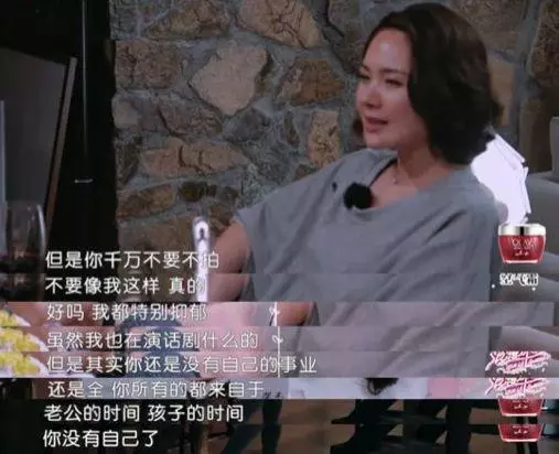 她所有的时间都是老公的时间,儿子的时间,却唯独没有了自己的时间。她自己也坦诚,虽然这些年也偶尔演演话剧什么的,但其实是没有自己的事业的,渐渐地失去了自我。