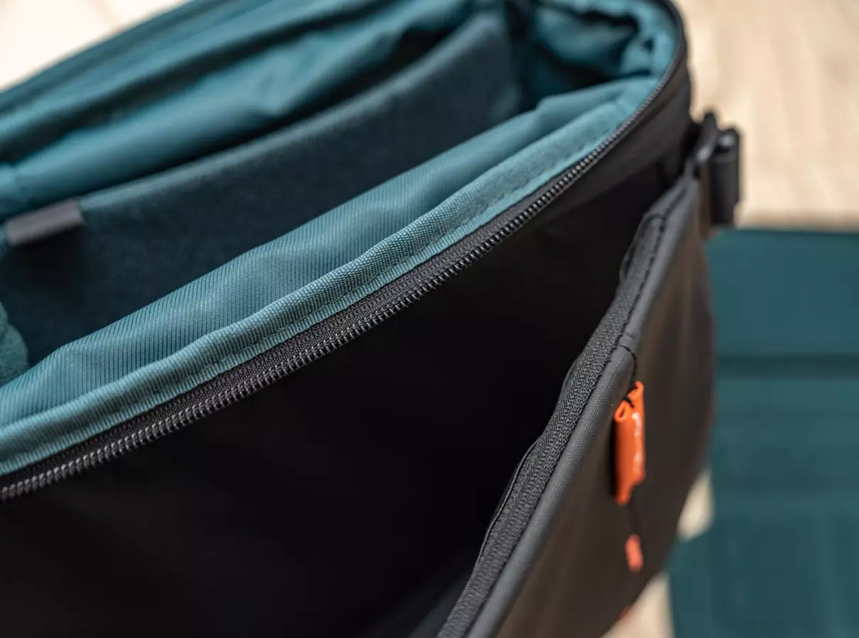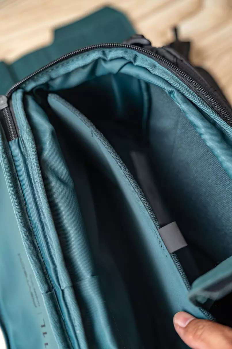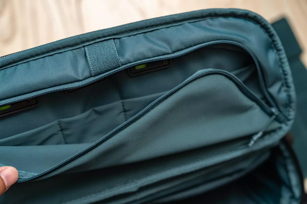 顶部就有一个拉链可以进行收纳,仔细看里面还有一个分隔的弹性网兜,可以放一下耳机和硬币,这点在 OneMo 早期的双肩包子包里就有的设计传承了下来。