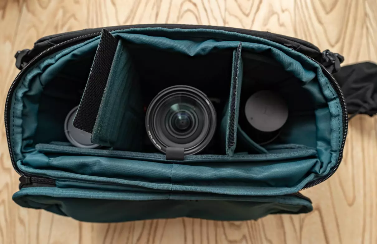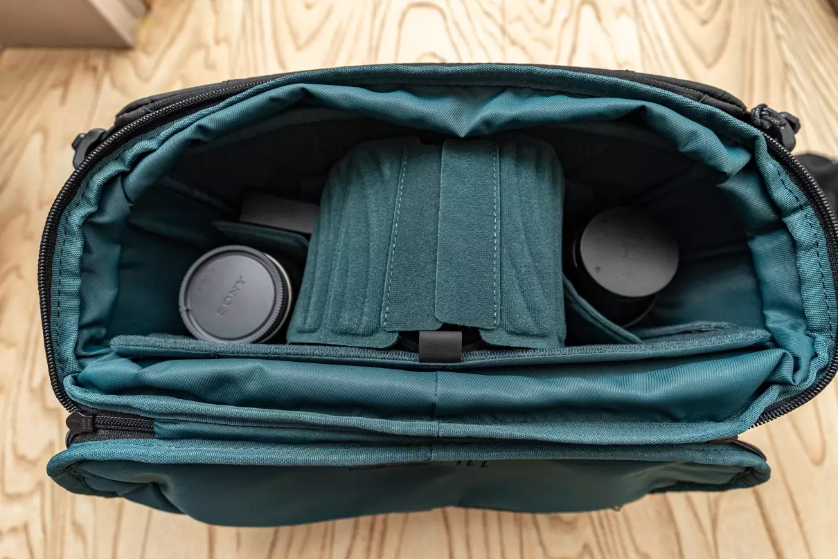 首先简单隔板隔开一下,我用索尼 A7M4 装上 24-70GM2 直接可以平放在中间,左右两侧塞了一个 PZ16-35 和 Batis 85 F1.8 镜头,一机三镜是轻轻松松的,而且上部分看的出还有很多空间,可以塞几个小蜜蜂等不重的物体。