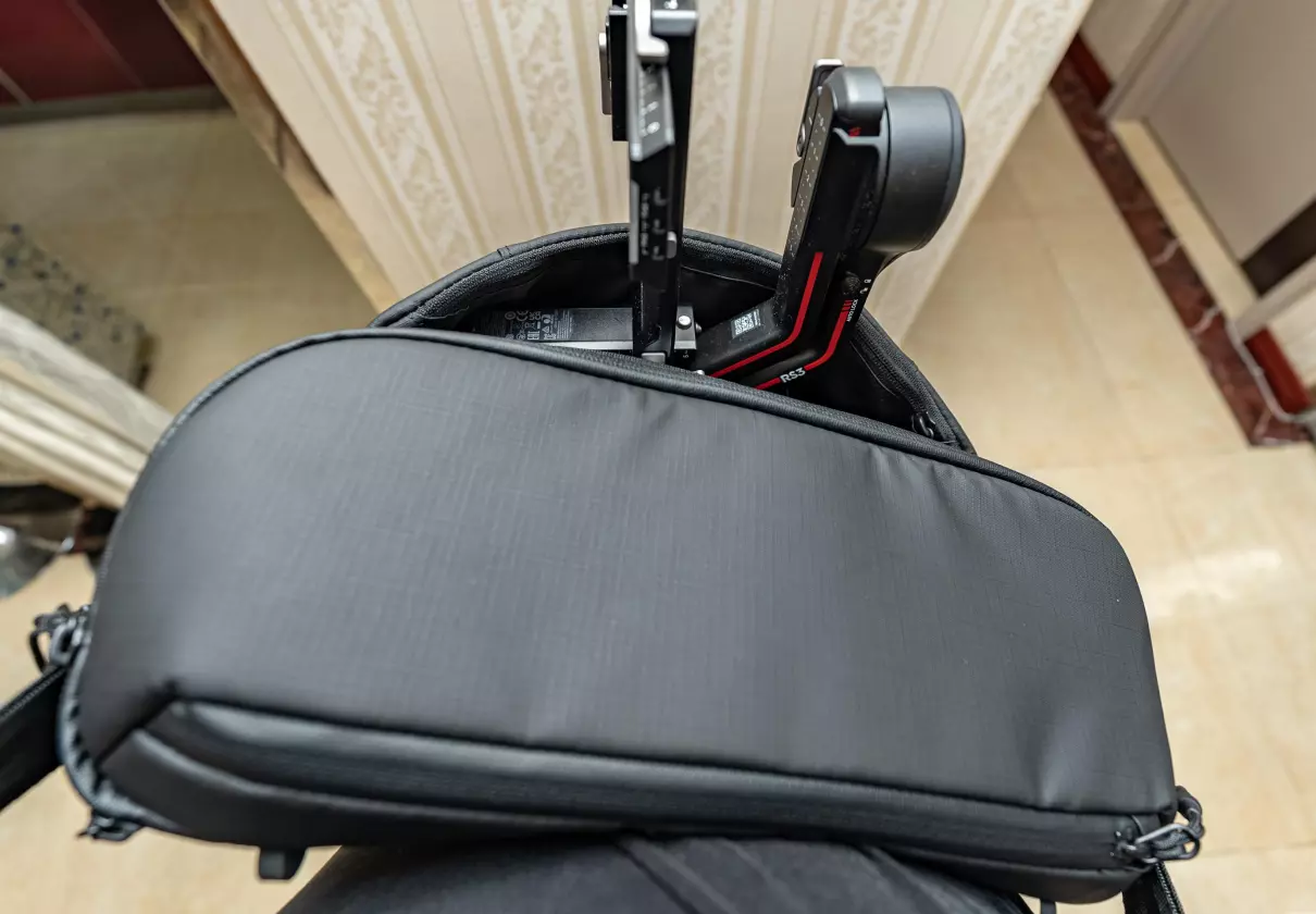 然后外仓和主仓中间其实是一个包裹的状态,可以斜插入一个稳定器或者衣物等临时用品,算是这个包的特色功能,等一会来实际收纳一下。