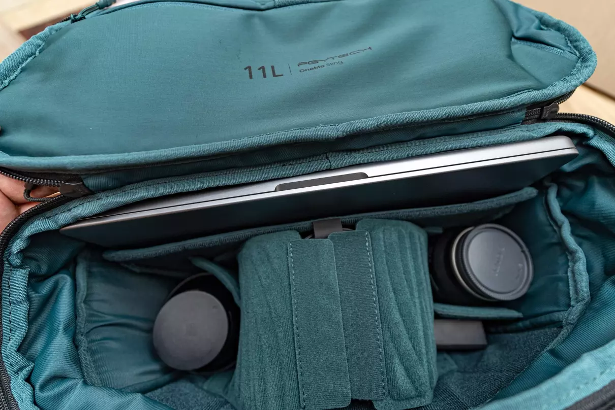 然后我试了下将 OneMo 11L 单肩包给扩容,就是把一圈拉链拉开,整个背包的纵深就变高了一些, 立刻就变成了 13.5L,14 寸的 MacBook Pro 刚好放进去。