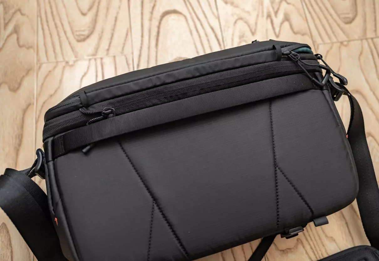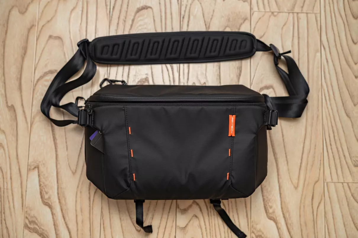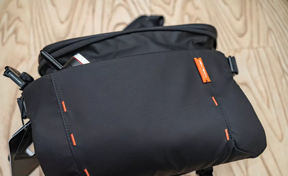 OneMo 单肩包 11L 的外形还是很有 PGYTECH 的传统风格,带红色的 Logo 缝制标识,还有红色线条的点缀,包外的材质摸着就是防水的,有一定防刮能力,不过根据我的经验,如果长期在恶劣环境,还是会造成伤痕,要注意。