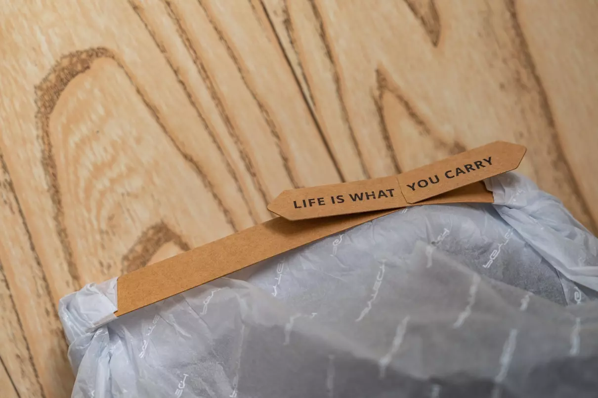 顶部的牛皮纸印着 LIFE IS WHAT YOU CARRY,这句话也挺认可的,看完之后,肯定就是扔掉了。